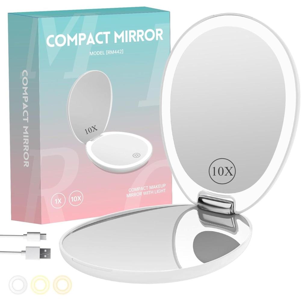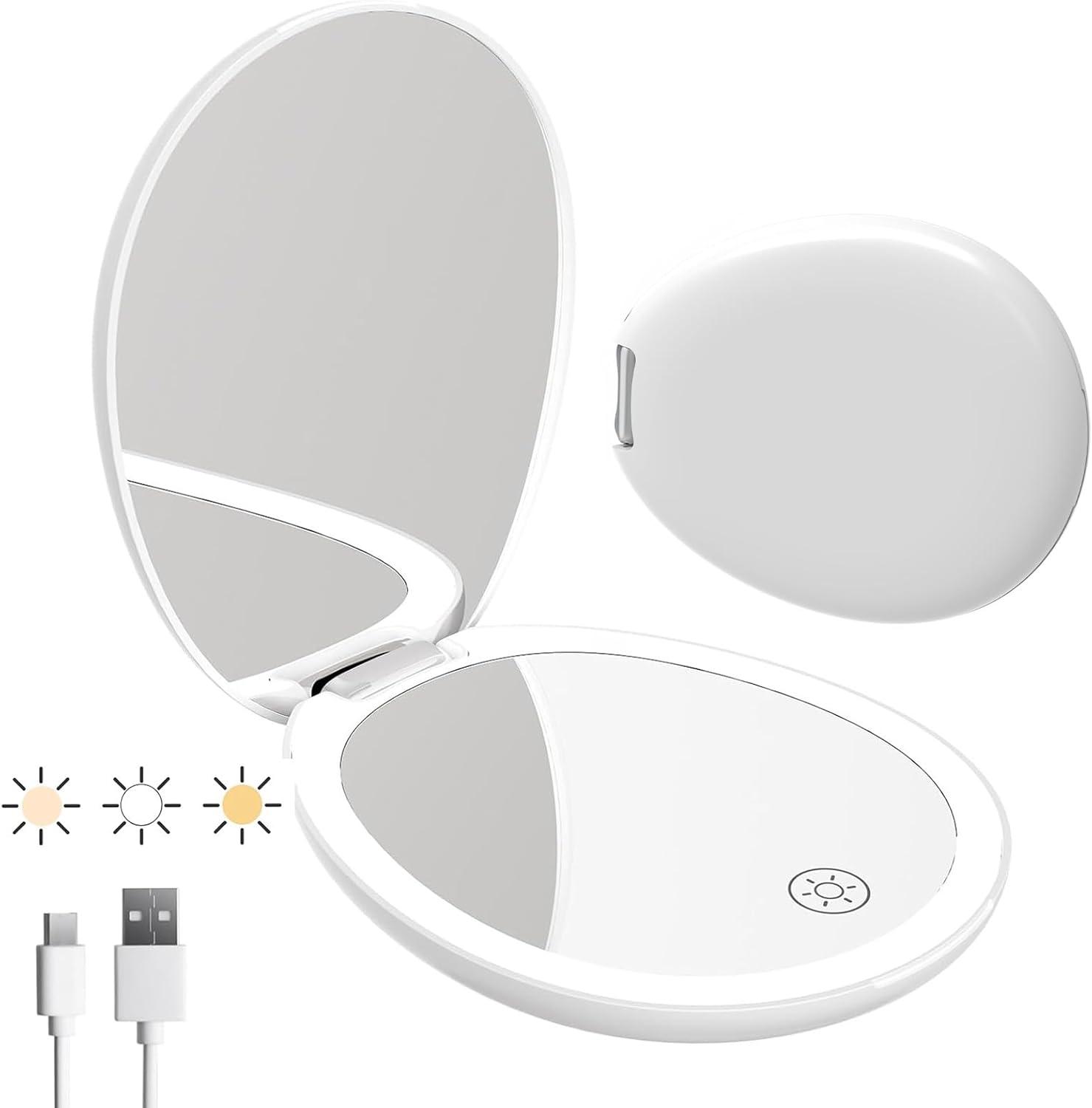 FUNTOUCH 10X Magnifying Travel Makeup Mirror with Light, Led Compact Mirrors with Light, Lighted Small 1x 10x Magnifying Mirro-r, 2-Sided Light up Pocket Portable Mirror, 3 Color Lighting(White)