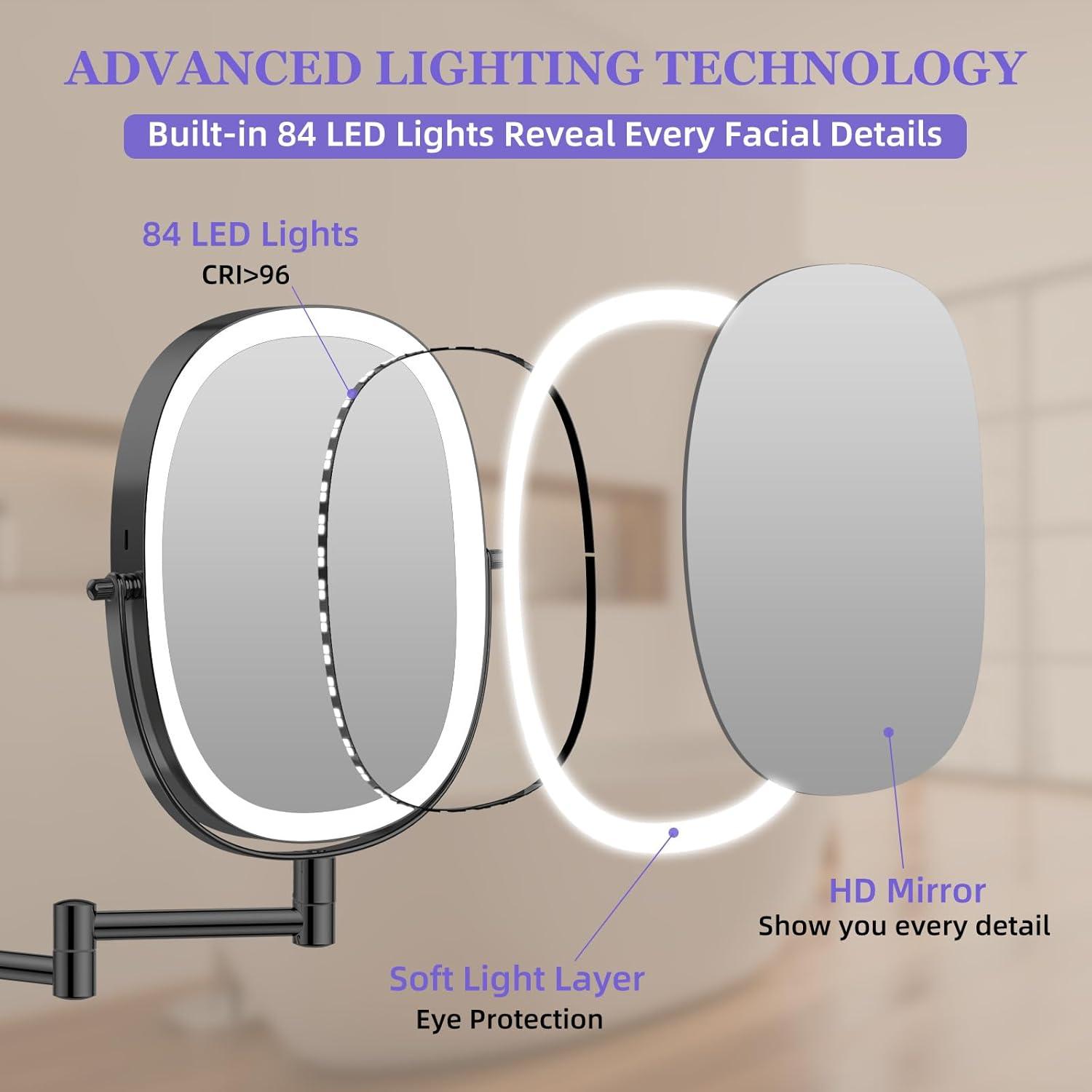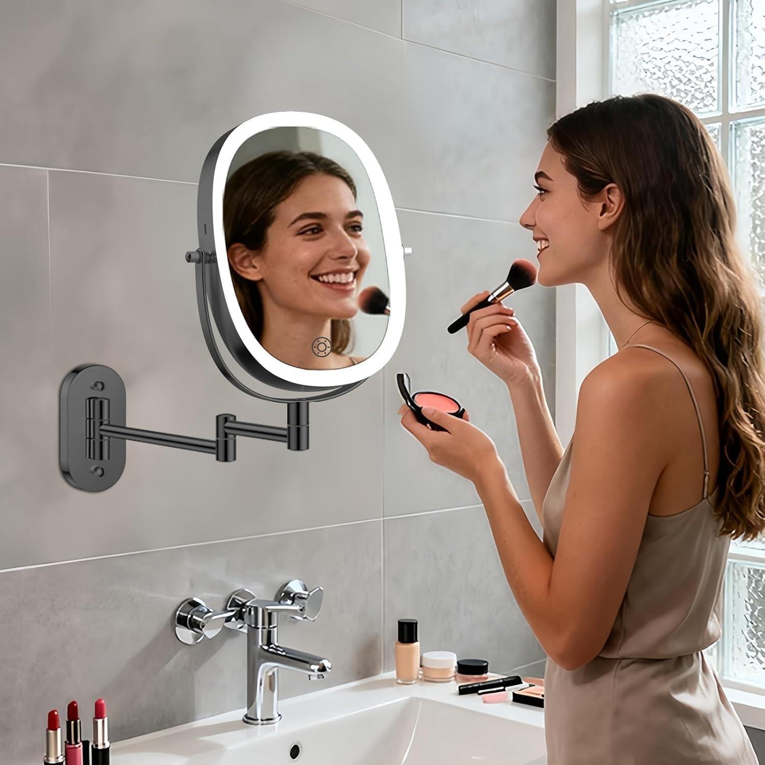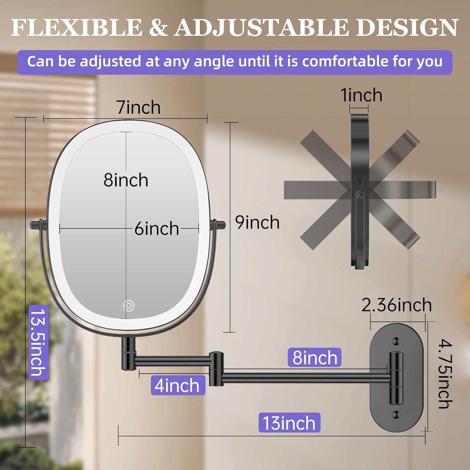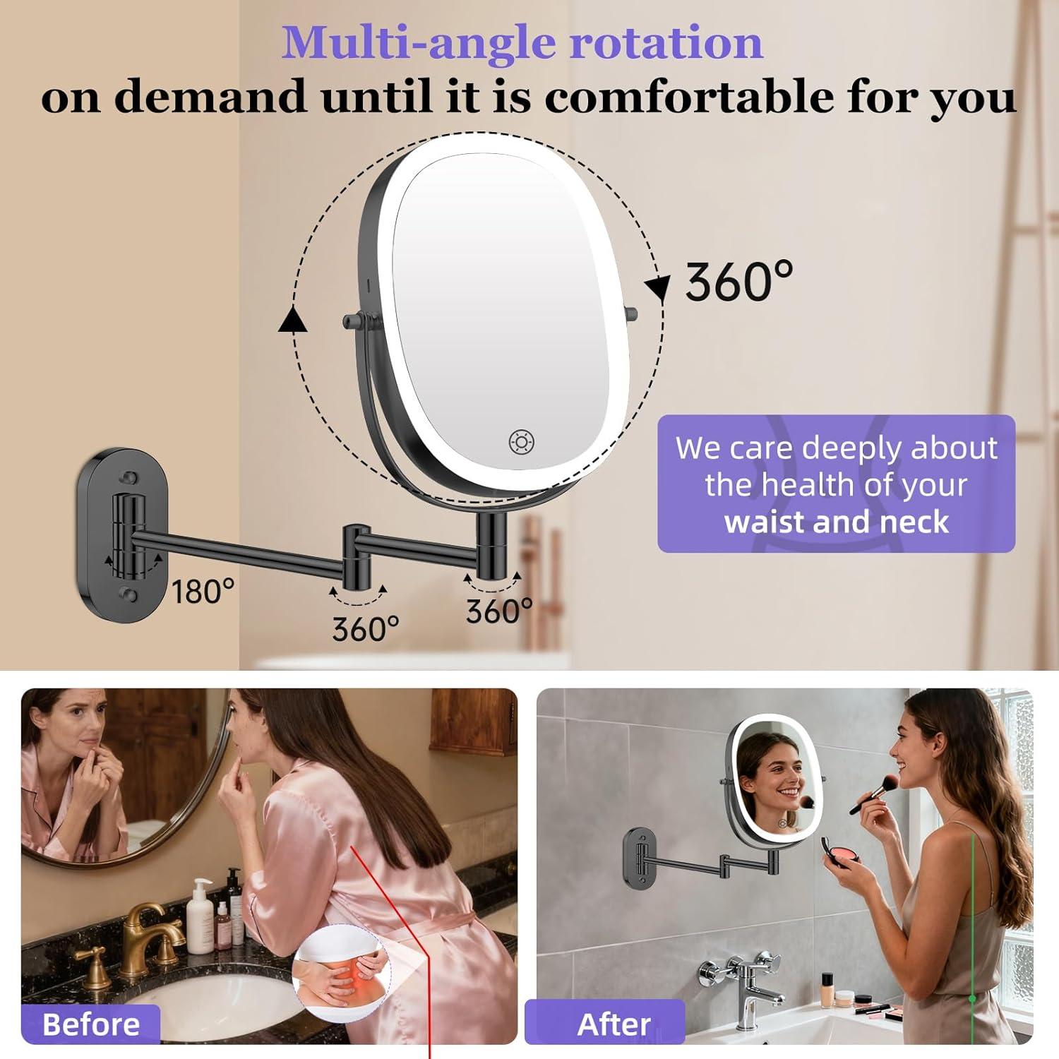【Wall-mounted bathroom makeup mirror with oval shape design】 This wall mounted magnifying mirror with light is designed with a oval shape (8 inch large size) , which can display the entire facial makeup, giving you a more comprehensive view. Compared to a round wall mirror, you don’t need to adjust the angle of the mirror to apply makeup.