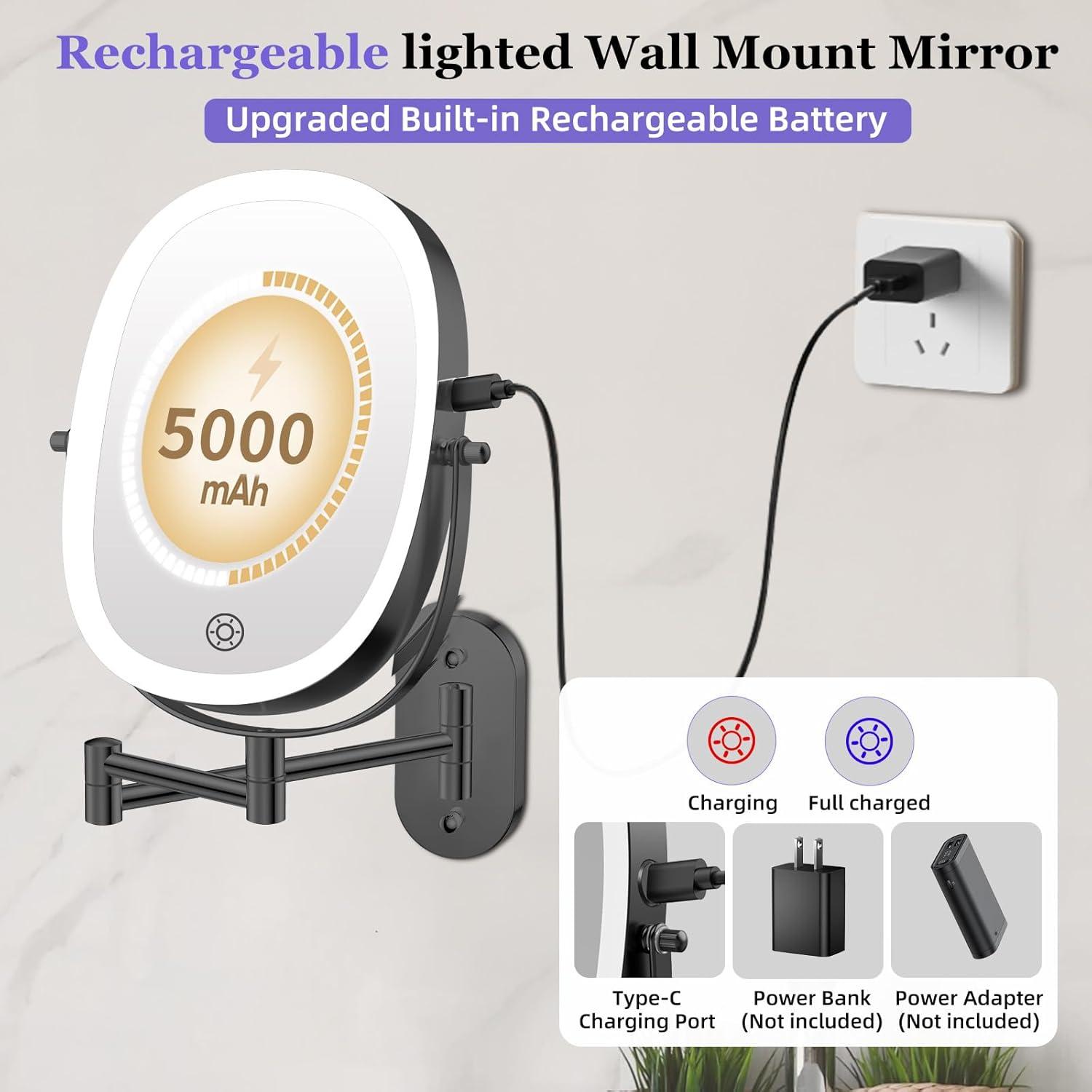 【Upgrade 5000mAh battery capacity wall mirror】The upgraded wall-mounted vanity mirror with light has a built-in 5000 mAh rechargeable lithium battery. Work for more than 13 hours after fully charged, half hours of daily usage, 16 Days of wireless usage.The large-capacity lithium battery provides a longer service life, so you don't need to replace the battery frequently. Type-C cable included (charger not included).