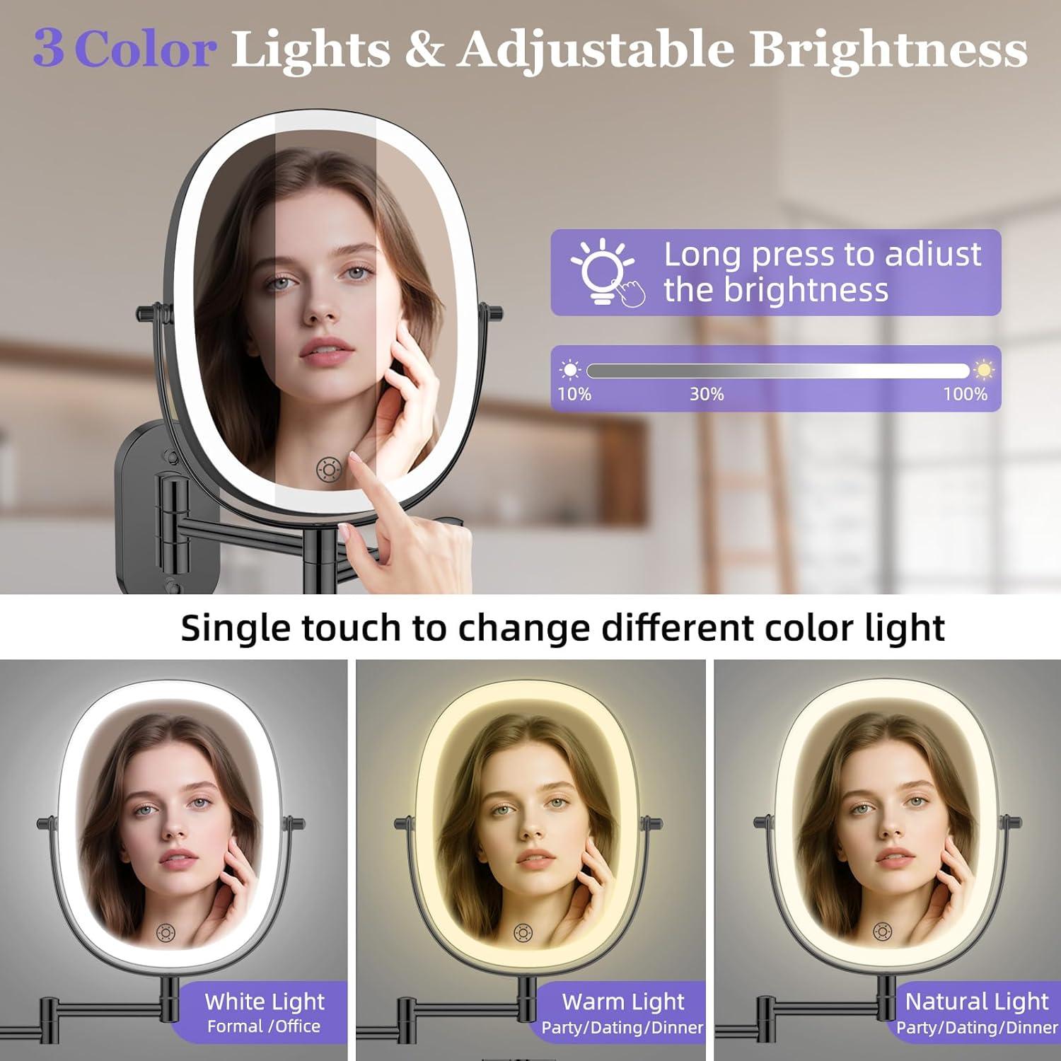 【Dimmable wall mount magnifying Vanity Mirror with 3-Color Lighting】This wall mount makeup mirror with lights features three dimmable color lighting options, allowing you to adjust the brightness according to your preference and lighting conditions. Whether you need bright white light for precise makeup application or a warm glow for a more relaxing atmosphere, this mirror has you covered.