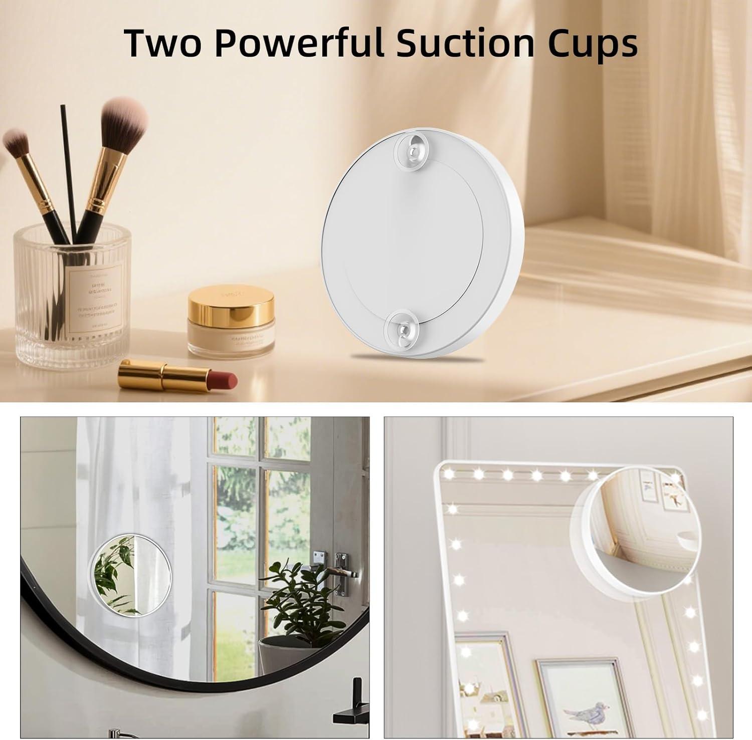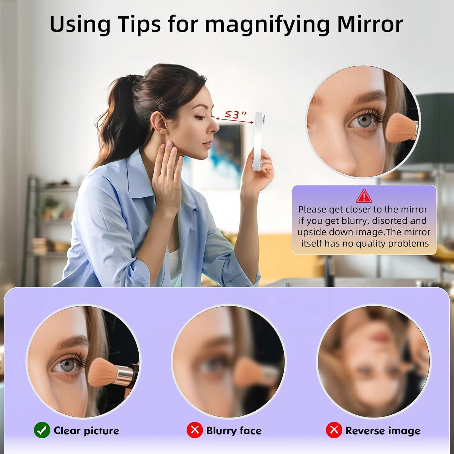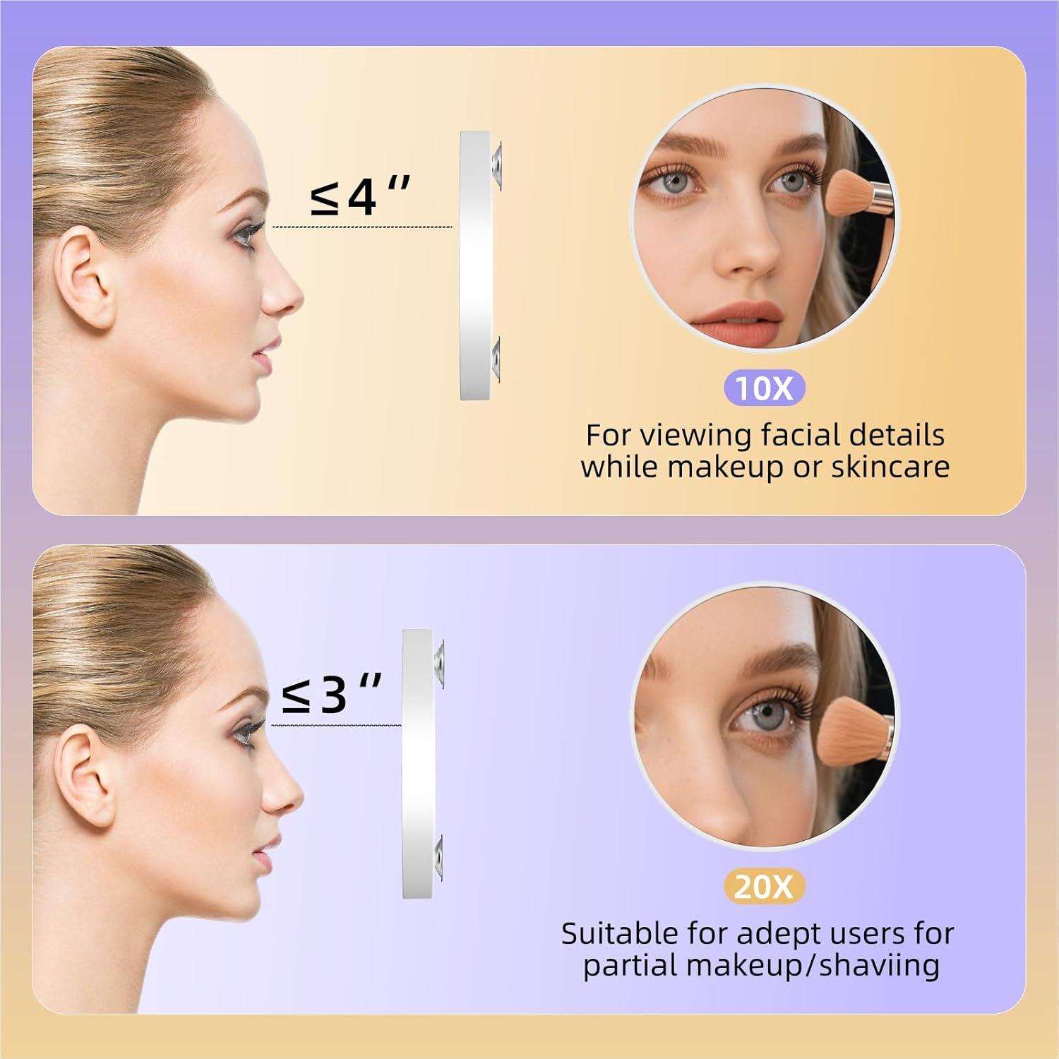 10X/20X Magnification Mirror:It comes with 2pcs small manification mirror, one is 10X mirror,for focusing on details when applying eyeliner, mascara, grooming eyebrows, or lipstick, making it ideal for creating a flawless and intricate makeup look. One is 20X mirror,suitable for adept users for partial makeup/shaviing.