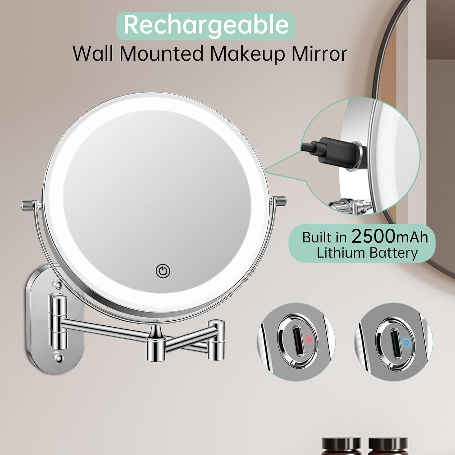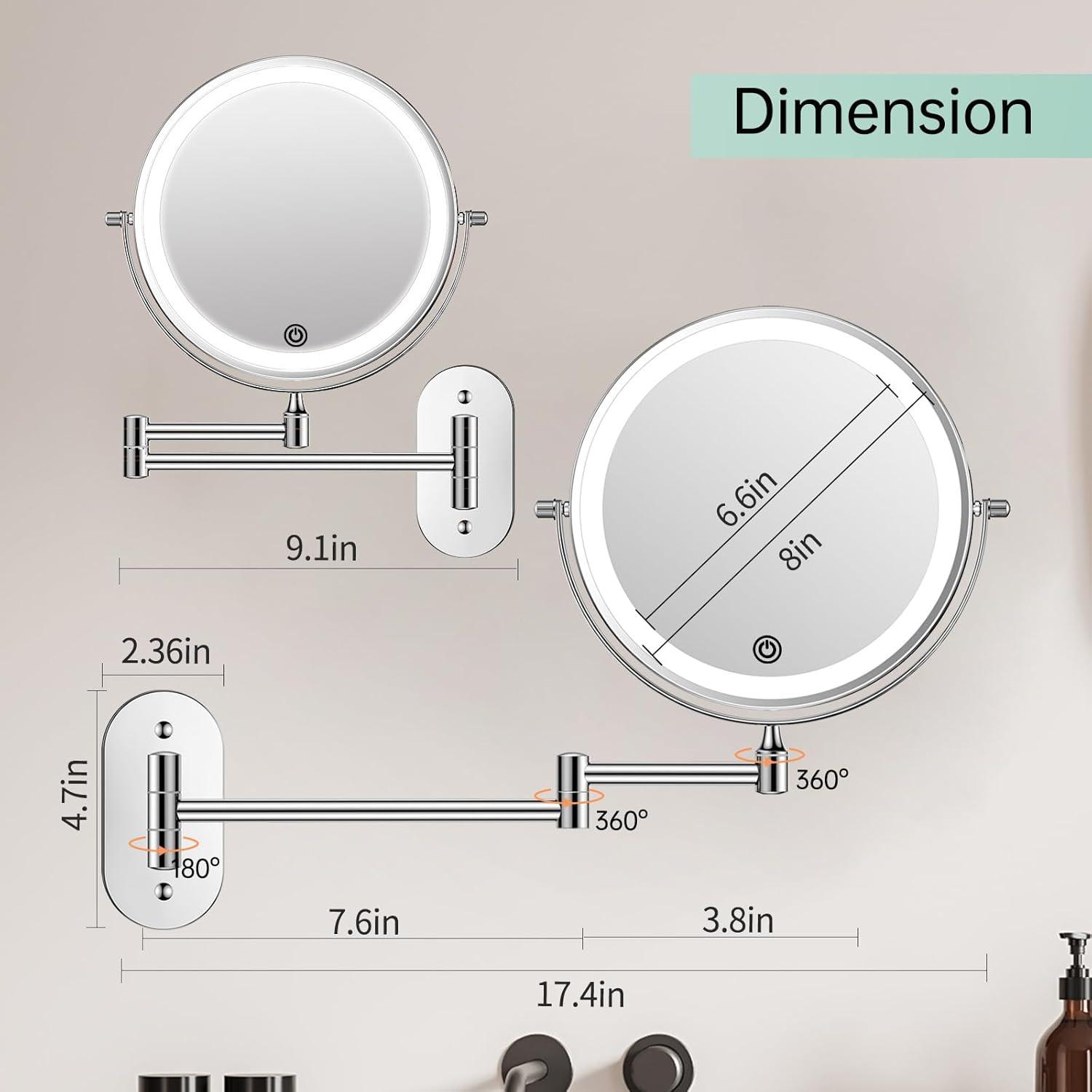Rechargeable Wall Mounted Lighted Makeup Vanity Mirror 8 Inch Double Sided 1X 10X Magnifying Bathroom Mirror, 3 Color Lighting, Touch Screen Dimming, Extended Arm 360 Rotation Shaving Light up Mirror(Bright Chrome20x)