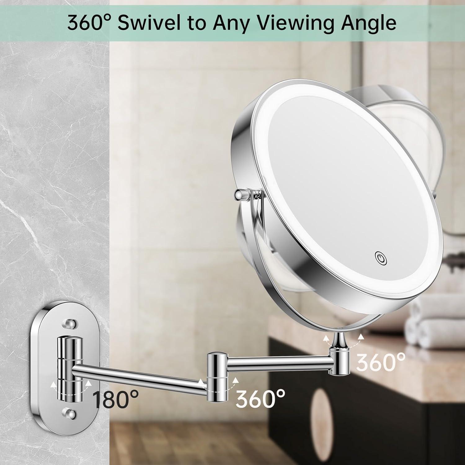 ๐ŸŽก๐Ÿ‘๐Ÿ”๐ŸŽยฐ ๐‘๐จ๐ญ๐š๐ญ๐ข๐จ๐ง & ๐„๐ฑ๐ญ๐ž๐ง๐๐š๐›๐ฅ๐ž ๐€๐ซ๐ฆ:The lighted makeup mirror with magnification is mounted on the wall, designed with a extendable arm. 360 degree free rotation provides you with a comfortable viewing angle when putting on makeup, shaving or wearing contact lenses. It can be folded against the wall to save space when not in use
